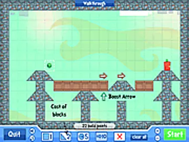 Purchase blocks with limited points to solve the puzzle of getting the smilies to their proper doors