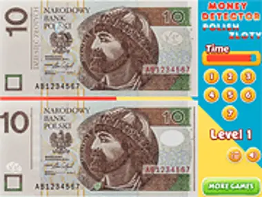 Βρείτε επτά διαφορές σε πανομοιότυπες εικόνες χαρτονομισμάτων 10, 20, 50, 100 και 200 πολωνικών ζλότι. Ολοκληρώστε πέντε επίπεδα, βρείτε όλες τις διαφορές σε κάθε επίπεδο και κερδίστε δεκαπέντε αστέρια.