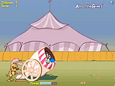This game is based on the popular TV show starring Ren Höek, a scrawny chihuahua. When irritated, he calls his friend Stimpy an "eeediot" and slaps him across the face. In this case he launches him out of a cannon.