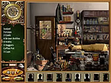 Follow Sherlock further into his investigation of Dr. Carstairs and the mummy Anan-thotep. Search the location for the items listed on the left, clicking on any you find. Click on the magnifying glass for a closer look, and on the pipe for a hint. You have 7 minutes.